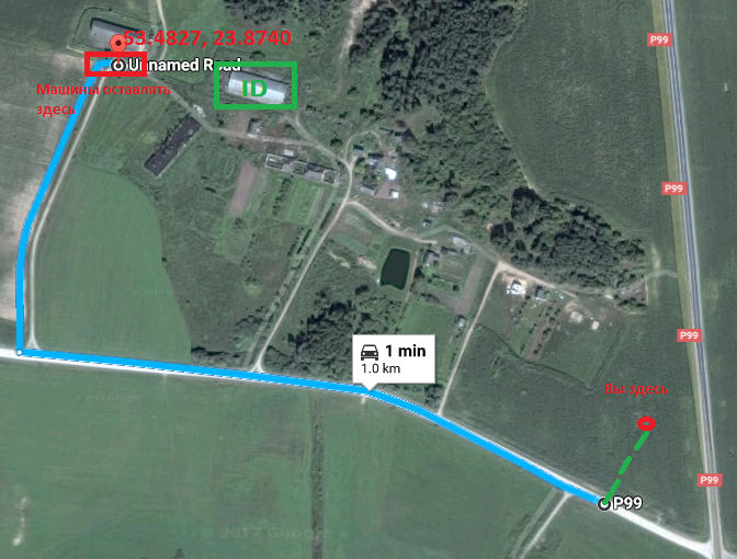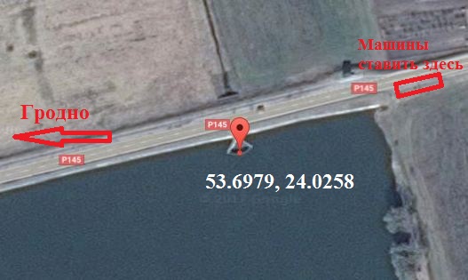 Вам следует прибыть сюда: 53.6224, 23.9981. Оставляйте машины так, чтоб не преграждать путь другим командам. Дорога узкая. Код доезда на трубе. Лезть никуда не нужно.