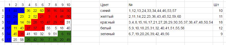 В здании можно найти таблицу с цифрами и много численных кодов разных цветов(белый, красный, желтый, зеленый, синий). Подсказка №2 для всех (20 минут) Количество кодов в зависимости от цвета: Синих - 10 Зеленых - 9 Красных - 18 Желтый - 11 Белых - 12. Подсказка №3 для всех (25 минут) Белые: 25, 58, 41, 10, 32, 9, 55, 5, 51, 18, 40, 31 Подсказка №4 для всех (30 минут) Желтые: 36, 22, 60, 23, 2, 52, 14, 59, 11, 43, 45 Подсказка №5 для всех (35 минут) Зеленые: 6, 19, 26, 42, 39, 7, 56, 20, 49 Подсказка №6 для всех (40 минут) Синие: 1, 53, 12, 57, 34, 13, 44, 24, 46, 33. Подсказка №7 для всех (50 минут) У Вас должен был получиться флаг островного государства в Индийском океане.